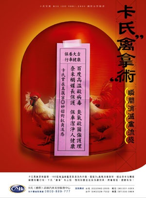 ![]() 但是擁有百度高溫的科技設備,能夠消毒清洗禽流感病毒的汽車美容廠商,屈指可數。卡氏關心每位車主的健康,特別耗資千萬,引進全台首見最新科技之「高溫高壓蒸氣洗車機」,以100度高溫及高壓8kg/c㎡ 之蒸氣水柱,清洗內外裝,瞬間強力消滅禽流感病毒!