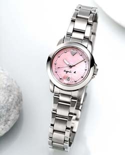 由Agnes b.設計操刀,SEIKO製造的Agnes b. 2005秋冬聖誕錶款Give Love系列,其中最醒目的錶款,是一只女錶,優雅的粉紅蝶貝上,清晰可見6點鐘位置富含藝術氣息的Agnes b. Logo,以及12點位置俏麗的立體心型時標,象徵愛到最高點,最適合男性用來送給女友當作耶誕禮物。
