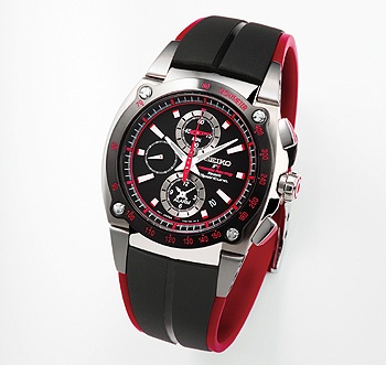 Sportura鬧鈴計時馬錶![]() ▲SporturaHondaF1鬧鈴計時馬錶<建議售價台幣約1萬6千元>Sportura鬧鈴計時馬錶上,面盤雕刻Seiko Sportura與Honda F1賽車隊徽,標示出兩個頂尖品牌的合作,該款錶採用無反射水晶玻璃及黑玉般漆黑的面盤,提供了可清楚閱讀的分段計時功能,而堅固的錶殼以不鏽鋼及螺絲旋入、固定於錶底蓋,以及旋入式錶冠提供了優越的防水功能,錶鏡則是抗磨損藍寶石水晶玻璃,並特別製作合成橡膠錶帶防止表面遭到溢出的機油所傷害,是Seiko特別向挑戰2006年F1賽事的Honda車隊致敬,所精心設計的錶款。