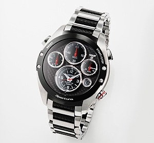 Sportura人動電能極限計時馬錶![]() ▲SporturaHondaF1人動電能限量計時馬錶<建議零售價台幣約15萬元>Sportura人動電能極限計時馬錶,集合了F1賽車重要元素,如手錶面盤上分別以藍寶石水晶玻璃分隔的四個獨立視窗的計時與報時裝置,以及賽車格紋旗製作的碳纖維面盤,並且搭配贈送擁有獨立編號的2006年Honda F1賽車重要的變速齒輪零件,令這款錶充滿了Sportura與Honda F1賽車所象徵的映像連結,包括速度、精準與完美的想像,還獲得精工原廠總裁執行長Shinji Hattori簽署認證。