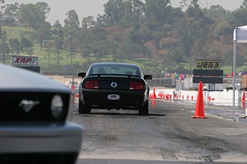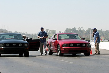 直線加速野馬初體驗 彎道改裝版殺遍四方雀躍不已的筆者扣上安全帶,看著眼前筆直的加速道就等著工作人員大旗一揮,未料才準備好就熄火,不太好的兆頭。打入一檔踩著有點沈的離合器,發現檔位很生澀,離合釋放點也偏模糊,工作人員再三交代別打入四檔,這條跑道煞車距離不夠(我沒提到他們只用「部分」跑道),起跑之後聲音很嗆,但是排入二檔我就失誤,只聽到轉速大聲咆哮趕快再排,原本期盼挑戰5.5秒的企圖落空,油門漸深感到扭力爆發,一股力道直推椅背再進三檔,竟然後輪又打滑,這扭力還真不是蓋的,當然想再繼續也不可能,後面還有一堆媒體代表等著,筆者蹂躪了一圈就此打住,感想是不必換檔的Mustang很猛,但一換檔那種生澀的檔位,實在不配這輛車的性能。