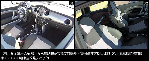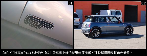 稀有珍貴一車難求值得一提的,這批全球限量2000輛的GP版MINI Cooper S,早在推出前便銷售一空,根本沒有讓人進駐展示間賞車的機會,透過北美MINI總部安排,筆者何其幸運逮到一輛直撲賽道,享受由MINI、John Cooper Works聯手的頂級佳餚。這批GP要價31,150美金,同樣為前輪驅動、前置引擎。動力是1.6升SOHC機械增壓四缸,最大馬力214匹、扭力25.49kgm。搭配的是六速密齒比手排變速箱,全車總重2600磅,其他軸距和車身基本尺碼與一般MINI Cooper相仿。