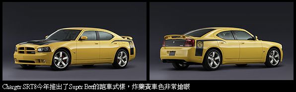 結語![]() 和過去駕馭Charger R/T相同,我會定義這是輛貼近Mercedes-Benz AMG為慣例的跑房車,而非可下場廝殺的超跑,儘管那些數據很吸引人,無論是馬力、煞車、抓地力與反應,但仍不足以躍升超跑之林,樂趣會出現在公路上,賽道只會凸顯這輛車的缺陷。 順帶一提,Charger SRT8今年推出一款名為Charger SRT8 Super Bee的跑車式樣。這輛車是以炸藥黃(Detonator Yellow)包裝,包裹得如一根黃澄澄的香蕉,將連內裝、排檔桿和方向盤都上黃邊配色,相當有意思。