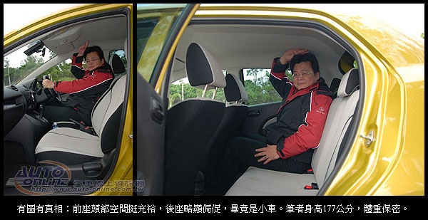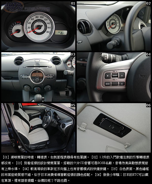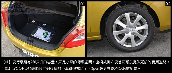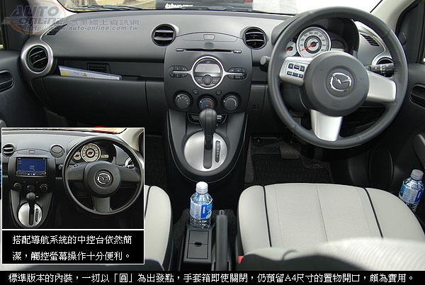 內部空間比照上一代規格配備水準各車款差距明顯 配備部分,本次試車的五部車都屬日規車款,輪胎規格有14吋和15吋的差別,甚至還有15吋輪胎還是鐵圈+輪圈蓋的樣式,不過相信未來進口台灣的款式應該是15吋鋁圈。 內裝的陳設差異也頗大,從只有時速錶到有轉速錶外加衛星導航系統,差距相當明顯。日規版本中,1.3升引擎搭配的是傳統四速自排變速箱,1.5升車款搭載CVT變速箱,特殊的Sport版本甚至有七段CVT變速設定並且搭載195/45R16的高性能輪胎,詳細規格可參考www.mazda.co.jp官方網站。 五月份將引進台灣的車款,預料將只有1.5升車型(進口車的價格沒理由引進1.3車款),至於是否搭載CVT變速箱則有待觀察,日系車經常把CVT款先留在國內。頭燈設計也有明顯差異,三圓環式的鷹眼頭燈為HID氙氣放電式,但也有一般燈泡的基本款,希望引進國內的是炯炯有神的鷹眼頭燈。 在新MAZDA2車上很高興看到類似NISSAN i-key的無線鑰匙設計,不需將鑰匙插入電門,帶在身上即可,不過並沒有另外設計一個圓形的START/STOP ENGINE按鈕,而必須旋轉傳統鑰匙孔位置的塑膠旋鈕來啟動引擎,不過這還算OK,至少引進國內的車款不能沒有。 即使和上代Demio的設計理念已經大幅轉變,前座頭部空間仍相當充裕,後座的腿部以及頭部空間對177公分的筆者而言是比較局促了些,流線動感的造型還是得犧牲一些頭部空間。