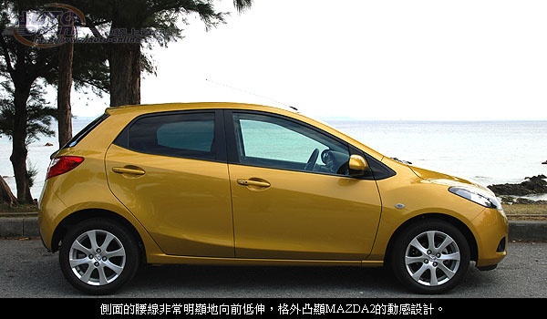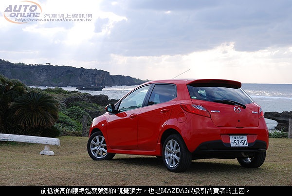 Zoom-Zoom再進化!驚艷動感惹人注目 車身尺碼上,全長3885mm比上一代短了41mm,全寬1695mm(略增15mm),全高則因設計理念改變而降低了65mm成為1475mm,2490mm的軸距則可爭取更多的車內空間。 MAZDA2最令人注意的外觀設計莫過於那條前低後高的明顯腰線,前後高度落差非常大,和前輪拱的弧線並未連成一氣,而創造出張力十足的線條。與之平行的窗框下緣線條則是設計精髓所在,前端下緣比上一代車款低了四公分,配合座艙前移的A柱位置,成功地開拓更寬廣的左右前方視野。 最近幾年許多新車走向縮小引擎室、A柱前移的Cab-Forward概念,但不少車款在A柱前移之後卻造成過彎時的視角阻礙,MAZDA2這種高視覺張力的設計是第一個運用大幅度降低A柱窗框下緣以克服轉彎視覺障礙的日系小車,相信未來會有更多新車朝這個設計前進。