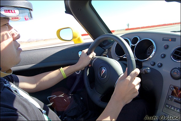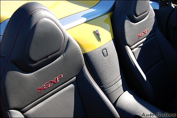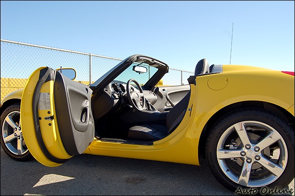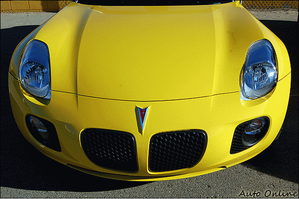 GXP在產品定位上,比一般Solstice更高一級,因此配備也較為齊全,包括備受好評的車頂隔音、胎壓偵測系統等,均列入標準配備,且在車色選擇上更為多元化。GXP體態上,仍是標準雙座Roadster,車頭亦是標準PONTIAC家族特徵,偏高的車尾襯托出俐落態勢,筆者試駕的黃色塗裝亮眼非常,原廠人員稱呼這是「Mean Yellow」,筆者思索半天很難翻譯,暫時定名為「蠻橫黃」吧!