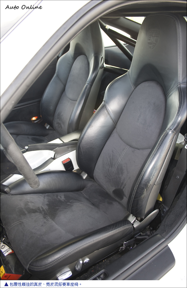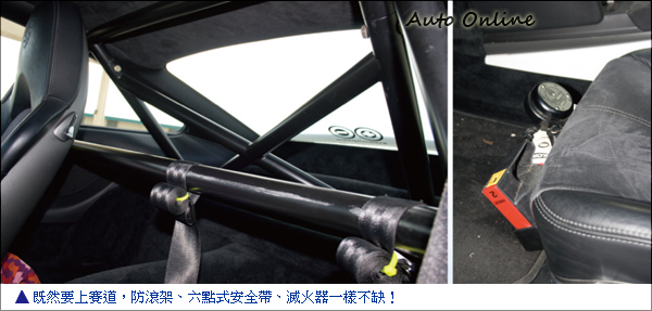 上述所說的必備條件,就是要有超乎一般人的體力。試想一下,這樣一部賽道機器,若是不用上賽道專屬配備,又怎能顯示出其身價以及不凡之處。因此,這部GT3原廠的賽車離合器相當的重腳,每每換檔都需要用力“踹”下離合器。同時為了保持清晰的操控感,方向盤雖有動力輔助,但是比較起一般車輛還是相當重手。再看看駕駛座下方的滅火器、原廠六點式安全帶以及選配的賽車防滾架,都說明了這部“日常座駕”隨時都可下場比賽。