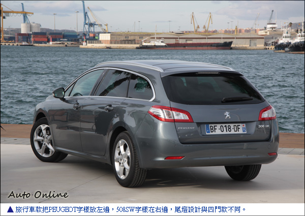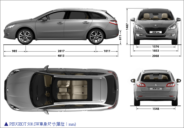 PEUGEOT 508同時推出三廂四門與SW旅行車款,與407相比,車長增加100mm達到4792mm,軸距增加90mm達到2817mm,使得後座腿部空間增加54mm,甚至比607增加22mm之多。前懸縮短了43mm以避免前保桿下方的損傷,後懸增加52mm使得行李空間增加66公升,達到497公升之多。旅行車款的車長更達到4813mm,空間便利性不在話下。