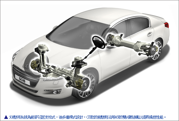 由於使用PSA Platform 3,與407以及CITROEN C5共用底盤,懸吊系統自然有許多共通的零部件,其中GT車型的前懸吊採用鋁合金雙A臂設計,實則沿用407 Coupe的運動型設定。其他車型的前懸則採麥花臣式,後懸吊則為具有副底盤的多連桿設計,確保舒適與操控間的平衡。