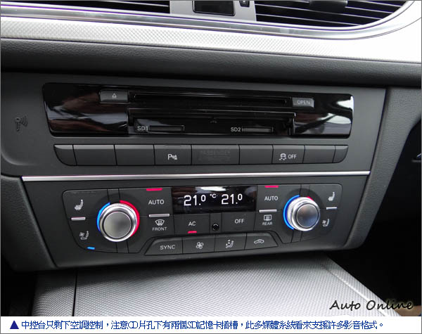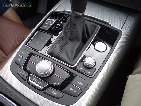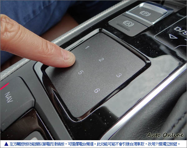 ![]() ▲多媒體控制介面MMI放在排檔桿周圍,導航、電話、收音機、影音媒體以及電腦選單都在此操作。引擎啟動鈕在排檔桿右側。座艙的各項人車介面可以說和A7一模一樣,只有內裝修飾風格略為不同。話雖如此還是很值得一提,例如大尺寸的並不是由下方升起,而是平推出後向上豎立在中控台正中央,操作旋鈕與按鈕則在中央扶手區的MMI介面,與音響控制按鈕整合在一起,於是中控台最下方只剩下左右空調的控制鈕,音響系統包括頻道選擇按鈕都放到了排檔桿之後的類似滑鼠觸控板,上面標示著1至6的數字,手指滑過便可選擇記憶的收音機頻道。