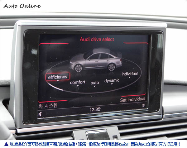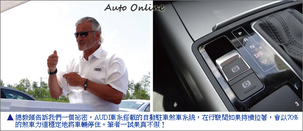 ![]() ▲在AUDI的設定上,quattro四輪驅動版才會給更高的引擎動力,畢竟前輪驅動版無法負荷太大的動力輸出。場地的另一邊安排了更大範圍的動態試駕區,用來比較AUDI A6 3.0TDI柴油款與3.0T機械增壓汽油引擎兩者的差異。教練要大家先開TDI柴油款,並使用不同設定來比較。柴油款多了一個efficiency模式可選,試圖以最吝嗇的給油與變速箱換檔時機來降低油耗,也多了個等紅燈時引擎自動熄火的系統。