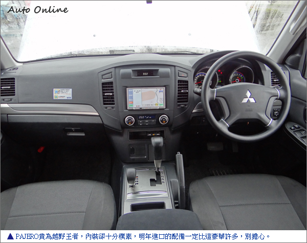 而PAJERO也是一樣,內裝簡潔得令人感動落淚,這年頭還有這麼樸實的大台SUV,果然是剽悍質樸的王者,相信當年郭靖使出的降龍十八掌就是這麼剛硬威猛得打遍天下無敵手。引進台灣之後那些LEXUS RX、INFINITI FX等花俏的娘泡一定會俯首稱臣。
