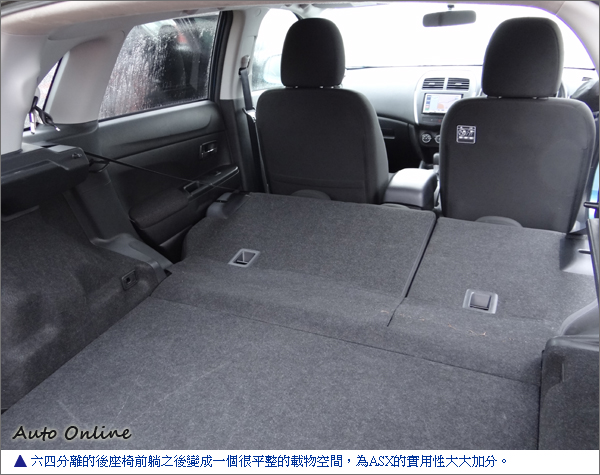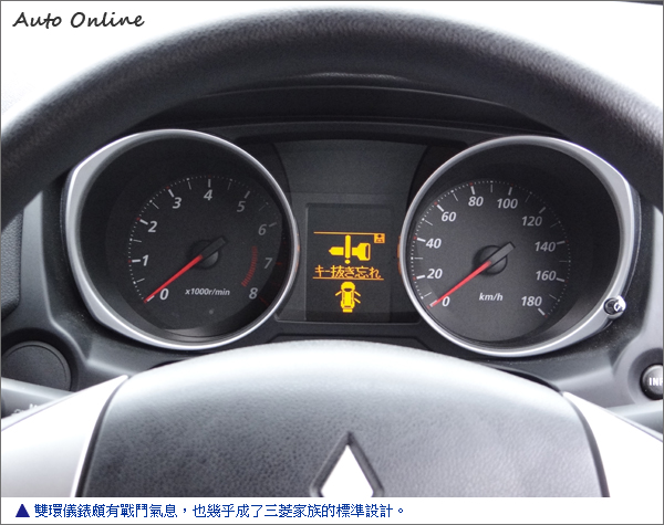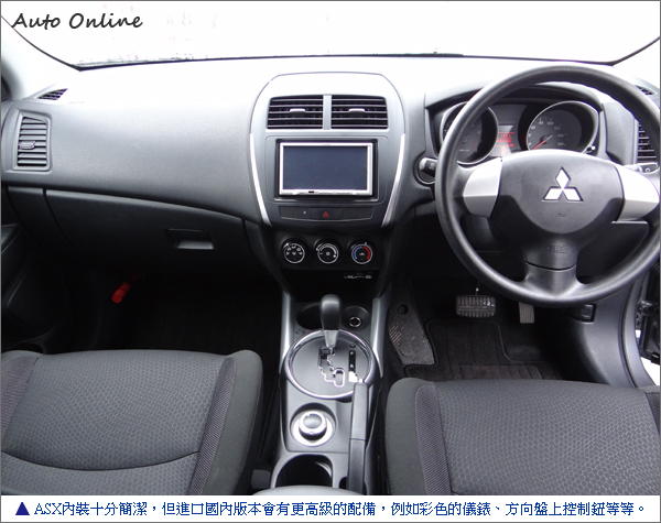 不過看到內裝可是令人相當地失望,中控台上一個2-DIN尺寸的多功能LCD螢幕,下方三個空調旋鈕,沒別的了,雙圓型儀表長得和Outlander沒啥兩樣,錶中間的資訊顯示幕還是單色的,亂簡潔的設計。
