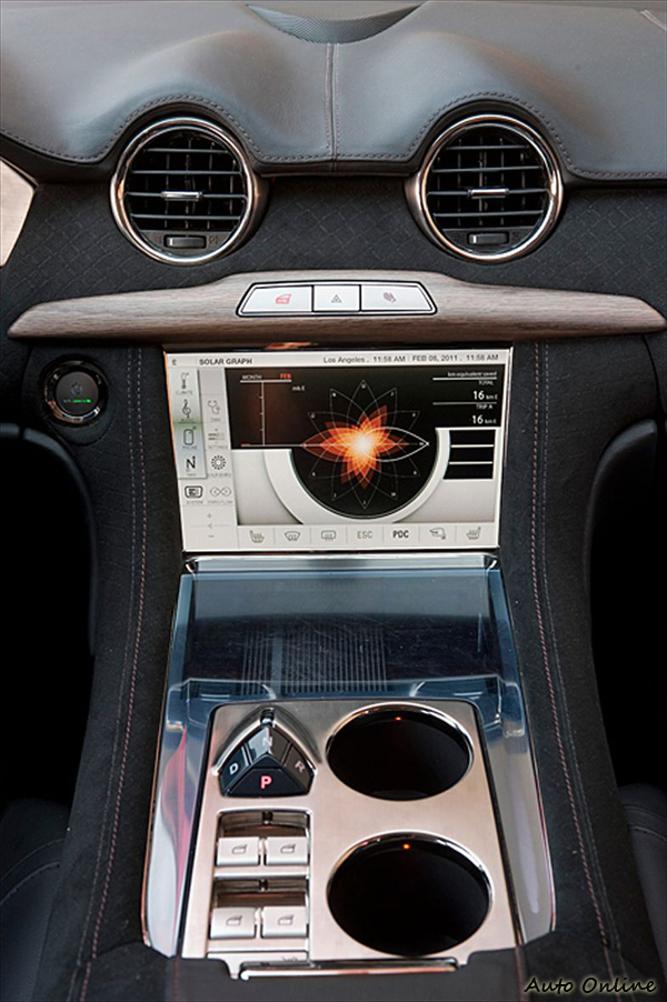 奇特的加速感 全新的乘坐體驗![]() ▲車頂已經全被太陽能版取代,可以提供額外的充電。先前筆者曾試駕過不同品牌的電動車,一般電動車與人的印象都是加速安靜且平穩,特別一踩電門便是扭力全開的特性是一般內然機引擎所沒有的。不過此次試駕的FISKER Karma,是屬於長距離電動載具(Extend-Rage Electric Vehicle),又由於汽油渦輪發電機只負責充電,並沒有直接傳輸動力的關係, 因此Karma在加速的時候同樣是扭力全開,只不過汽油渦輪發電機的“引擎聲”並不會隨著電門的深淺而有聲音大小的差別,這樣新奇的體驗是以往試駕電動車以及內燃機引擎車所不曾有的。 ![]() ▲既然是單速變速箱,那就沒有設置排擋桿的必要了!![]() ▲原廠標準配備22吋鋁圈,真的是很“緊繃”的選擇。![]() ▲充電中的FISKER Karma。相對位置當然就是加油口了。