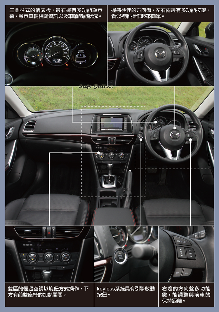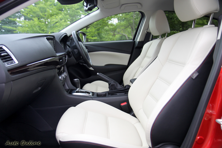 駕駛導向 提升科技配備![]() 以駕駛導向為理念的內裝設計,走的是樸實的風格造型,沒有太多不必要的花俏點綴。透過設計師巧手,將中控台線條與車門飾板整體連接搭配,與車外造型相同散發出律動感。中控台以黑色為主要色調,加上霧銀鍍鉻飾條與波爾多紅色飾板,讓車內產生強烈的衝突感,但這感覺又不會顯得突兀。 ![]() ▲日本販售的Mazda6配置功能完善的衛星導航影音系統,不知道台灣販售板會配置哪款影音系統。![]() ▲I-FLOOP動能回收系統做動情形,車輛相關動態資訊都一目了然。![]() ▲儀表板下方有,車道偏移系統、自動熄火以及變換車道後方警示系統的開關。![]() ▲雙前座座椅泡棉重新包覆,提升乘坐舒適度,並且搭配電動調整功能,有不錯的乘坐表現。![]() ▲車裝的搭配顏色有兩款可選,除了全黑之外,還有椅面白色、椅背黑色特殊顏色。![]() ▲方向盤後方有換檔撥片,有效的增加車內跑格化。![]() ▲後座頭部空間受到流線的車頂影響,會讓人感到些微的壓迫感。![]() ▲後座冷氣出風口是中大型房車標準配備,舒適的乘坐環境才是消費者所要的。![]() ▲在SKYACTIV車身引導科技,後座乘客腿部空間擴大了37mm,膝部空隙擴大43mm。![]() ▲增加車室空間卻間接影響到行李廂空間,比起上一代Mazda6,後車廂容積小了一點只有436L。