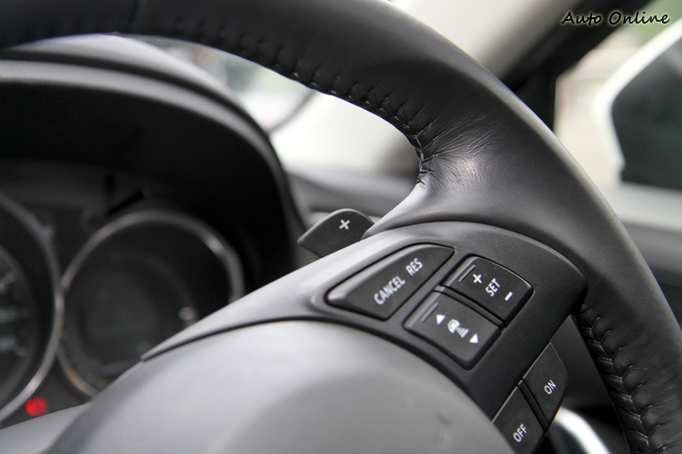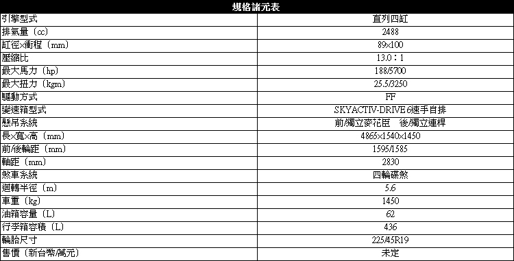 SKYACTIV先進科技 節能同時擁有性能![]() ▲搭配6速的手自排變速箱,藉由加大鎖定離合器的控制區域,並且透過修改離合器減震彈簧的剛性,提高離合器的耐久性。在動力部分,全新Mazda6有分三種動力,汽油有2.5L與2.0L,柴油則有2.2L車型,而這次試駕的為2.5L汽油引擎動力。汽油動力引擎在全新Mazda科技中被稱之為SKYACTIV-G系列,透過技術革新,實現13.0的高壓縮比,大大提升燃油效率,同時還採用了多孔式噴油嘴、凹孔活塞、加長衝程,並且精心配置強調提升扭力的4-2-1排氣頭段,讓這顆2.5L引擎能有優異的動力曲線輸出。 ![]() ▲這次試駕的2.5L引擎動力,最大馬力有188hp/5700rpm以及最大扭力25.5kgm/3250rpm,透過程式優化的油門輸出訊號,可以明顯感受到油門反應靈敏。
