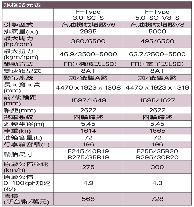不過說F-Type純粹,好像也太恭維了它,至少原廠還是為了提高賣相想辦法把它複雜化。舉例來說,車尾的擾流板車速超過100km/h時就會自動升起,直到低於65km/h後才會收回,沒事還可手動控制升降。雖然這套尾翼最高可提供120kg的下壓力,感覺有其存在的價值,不過個人的看法是,F-Type最車最美的地方就是車尾線條,它也根本不是為賽道而生的車,這玩意只會破壞美感,真是多餘。而排氣管3.0 SC和5.0 SC配置上也不一樣,前者是中置雙出,後者則採雙邊雙出的四尾管設計,但怎麼看都是口徑比較大的3.0 SC中出氣勢更勝一籌。