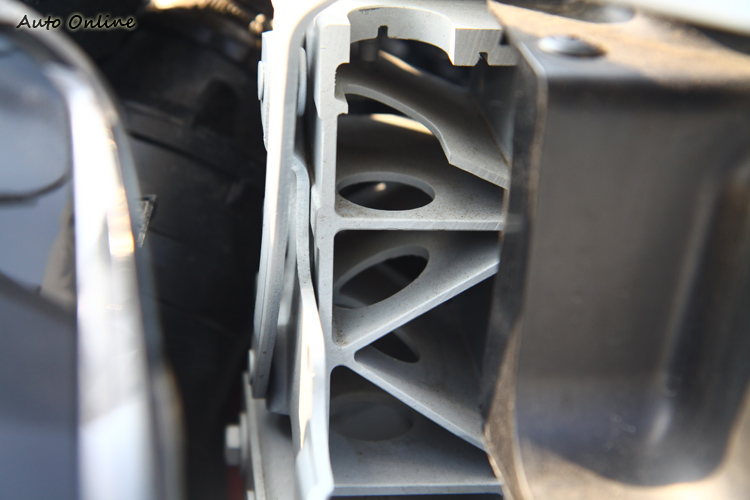 ▲從縫隙中可以看見鋁合金車身內部的強度與輕量化設計結構。