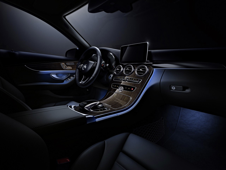 內部空間方面則訴求高等級的材質,豪華、優異觸感、精確手工的縫線,達成豪華車必備的氛圍。駕駛與乘客座擁有寬敞空間與摩登時尚的設計。若與以往C-Class的定位比較,已「從經濟艙升等為商務艙」,夜間室內的多色LED反射照明氣氛燈,直接從S-Class傳承而來,提升不少奢華的尊榮感。