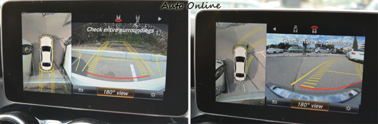 ▲倒車或駛出車位時都有180度廣角視野輔助,預測行車路線非常準確,還有模擬上方空照視野。