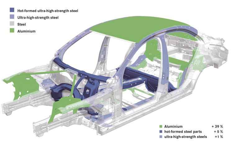 與前一代相比,鋁合金材料的使用比例從9%狂增到48%,如此大規模的使用在量產車,且不是頂級的大型房車上,在同級車中可謂創舉。大量鋁合金鑄造材質與超高強度金屬材料的使用,有效控制撞擊時的衝撞力分配,也讓乘客艙的安全性大幅提升。車廠之間的激烈競爭確實能促進汽車高科技的普及化。