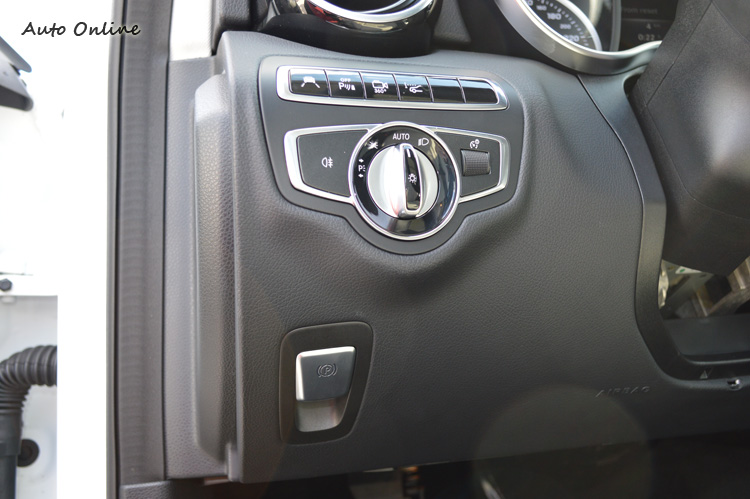 電子駐車剎車也全面普及於新C-Class車上,位置在方向機左側燈組旋鈕的下方,只需輕按便可啟動,輕拉即可釋放,也可開啓Comfort Go功能,踩下油門即自動釋放駐車剎車。如果車輛時速在4km/h以上按下,還會啟動ABS與ESP的系統,協助採取緊急剎車的輔助。