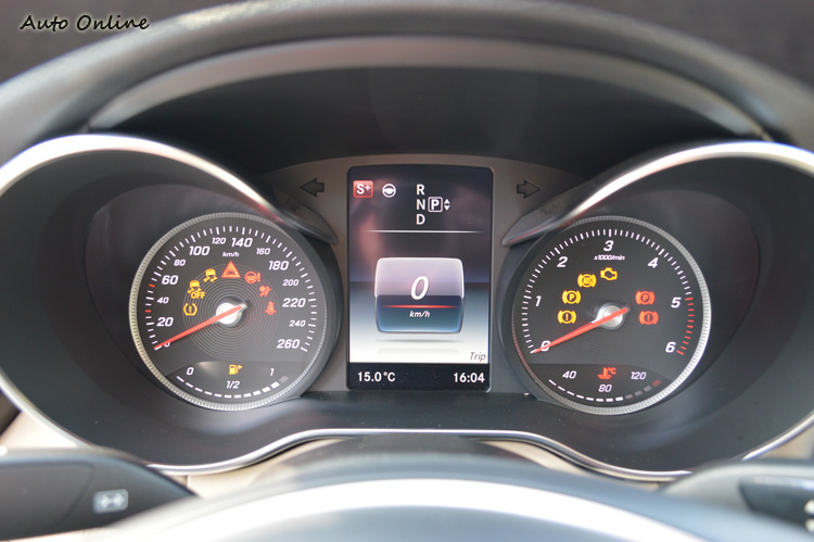 ▲雙環儀表加上中央顯示幕一向是賓士年輕系列或跑車版的設定,表示C-Class是在年輕跑格與豪華中取得平衡的中央伍設計。