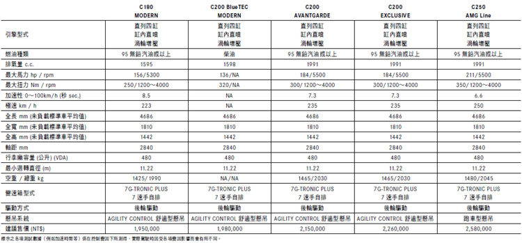看了新C-Class那麼多項重大進化,是否已經心癢癢了呢?截稿前台灣賓士公佈了建議售價,並將在七月底左右隆重上市,引進的車型包含一款柴油引擎與三款汽油引擎。最入門的C180 MODERN採用1595cc的缸內直噴汽油溫輪增壓引擎,最大馬力156hp/5300rpm,最大扭力250Nm/1200~4000rpm,建議售價NT$195萬元。柴油款引進的是C200 BlueTEC MODERN,採用1598cc柴油引擎,最大馬力136hp,最大扭力達320Nm,建議售價NT$198萬元。較高等級的兩款C200採用1991cc缸內直噴汽油渦輪增壓引擎,最大馬力為184hp/5500rpm,最大扭力為300Nm/1200~4000rpm,AVANTGARDE版建議售價NT$215萬元,EXCLUSIVE版為NT$226萬元。最頂級的C250 AMG Line除了有AMG套件與運動型懸吊之外,同顆汽油引擎的馬力也調升為211hp/5500rpm,扭力也調高到350Nm/1200~4000rpm,建議售價為NT$258萬元。