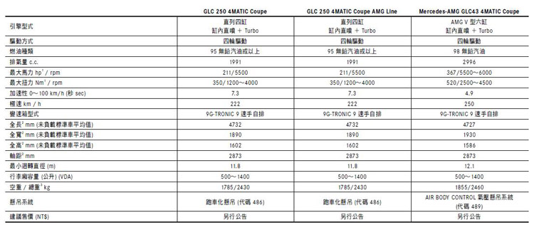三款車型預定12月發表![]() ▲GLC Coupe共搭載包含汽油、柴油、油電等八種動力,引進台灣只有2.0四缸與3.0V6兩款汽油引擎。GLC Coupe即將於12月引進國內,將有三種車型、兩款汽油引擎。分別是我們這次試駕的GLC 250 4MATIC Coupe、搭載AMG套件的GLC 250 4MATIC Coupe AMG Line,以及性能強大的Mercedes-AMG GLC43 4MATIC Coupe。 ![]() ▲GLE350e Coupe插電式油電混合車也在現場讓我們體驗,可惜時間不夠,沒試駕到,台灣仍未打算引進。