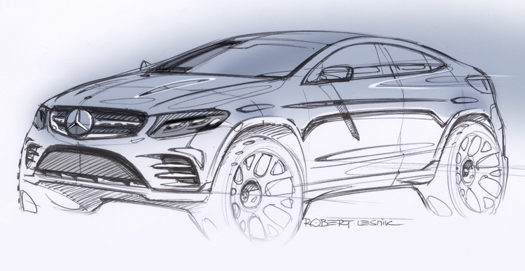 ![]() ▲水箱罩如鑽石、繁星般襯托尊貴的三芒星賓士廠徽,刀刃狀的橫柵飾條是Coupe家族專屬。豪華跑車與休旅的衝突美感承襲新世代的賓士家族面貌,水箱罩正中央大型廠徽平面化,後方隱藏著智慧行車輔助系統的雷達,左右兩側雙刃般刀形鍍鉻飾條是Coupe車系的獨有特徵,從三芒星廠徽向兩側放射狀散出無數六角形的鍍鉻飾點,如繁星、鑽石般璀璨,充分襯托豪華尊貴的品牌形象。![]() ▲雙出霸氣的尾管,輪拱延伸至後下擾流的防刮材質點出SUV的特質。LED尾燈組扁平向兩側延伸,小鴨尾擾流與小面積的後窗,結合成跑車與休旅車的合體美感。![]() ▲手繪草圖描繪了一部既可兇悍狂飆,又具輕越野力的全能跑旅!