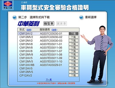 ![]() 即日起,中華三菱全省164個服務廠安排專人諮詢,並現場協助包括”中華威利”、”中華菱利”、”得利卡”之廂型車與貨床車,以及”SPACE GEAR”休旅車之車主下載原廠「車輛型式安全審核證明」之相關文件。另外,車主也可免出門在家上網連結至中華三菱網站(www.5230.com.tw),自行下載取得相關證明文件,而網站上亦同時載明詳細法規及使用說明,供所有車主參考!車主若有疑問,可撥打中華三菱0800免付費服務專線(0800-030-580來三菱•我幫您)進行相關諮詢。