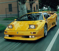 藍寶基尼於一九八七年底隸屬於克萊斯勒旗下後,即朝車身輕量化、馬力強勁化及四輪驅動化的尖端車型努力,前述的L25型是起步,而隨後推出的Diablo則是終極車款。 Countach於一九八八年接受最後的訂單後,在一九八九年終止了持續十九年的生產。接棒的是藍寶基尼和克萊斯勒共同開發的Diablo,義大利文的原意是「惡魔」,而對所有的競爭對手來說,則是「惡夢」。基本上它承襲了Countach大部分的設計理念,但在精緻度方面則更上層婁。 Diablo的心臟-引擎,由原來的V型十二缸DOHC四十八氣門五千二百西西,擴大為五千七百西西,採用燃料噴射系統及電子控制式點火系統,擁有四百九十二匹馬力及五十九點二公斤米的扭力輸出,極速可達三百二十公里,輕鬆的衛冕成功,接替Countach再度成為九○年代的魅力車種。 藍寶基尼所以能在車壇上獨樹一幟,其前衛的造型應居首功。而擔綱捉刀的則是博通(Bertone)設計公司的首席設計師馬爾切格‧甘迪尼(Marcello Gandini),他有個同業稱羨的稱號「天才車身設計師」。 二十七歲進入博通公司的甘迪尼,主掌設計檯的第二年(一九六六年)就推出首場好戲-超級跑車Miura,接下來的Marzal、Urraco、Bravo及Espada更是連台好戲,轟動了全世界車壇。而Countach則是這位設計大師鬼斧神功的純精演出。特別要提醒車迷的,是Countach向上方垂直開啟的兩扇車門,並不是「鷗翼式」設計,而係甘迪尼的獨門巧思「刀鑑式」,也正因此,Countach得以獲致左看成峰,右看為嶺,百看不厭的怪異出眾的形象。